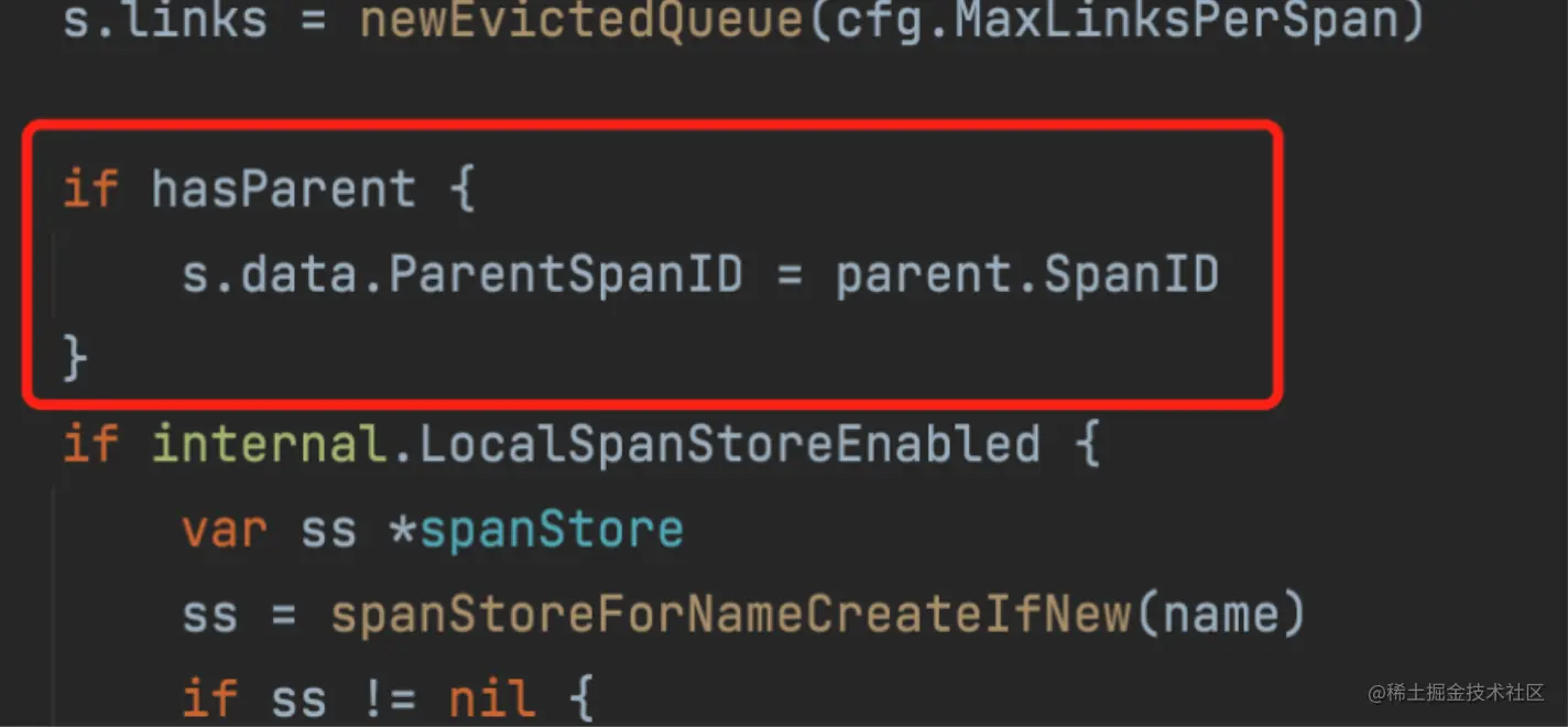 这里如果在调用startSpanInternal()方法的时候hasParent为false(为nil)则会自动生成随机的traceId,显然不是我们想要的,而上面说明startSpan()方法是从ctx中获取parent,而startSpanWithRemoteParent()从形参中获取parent,因此我们使用第二方法用于在获取前端的traceId之后创建我们整个trace链路的第一个span,之后将span信息存入ctx于内存中传递,此后都调用startSpan()方法创建以后的span