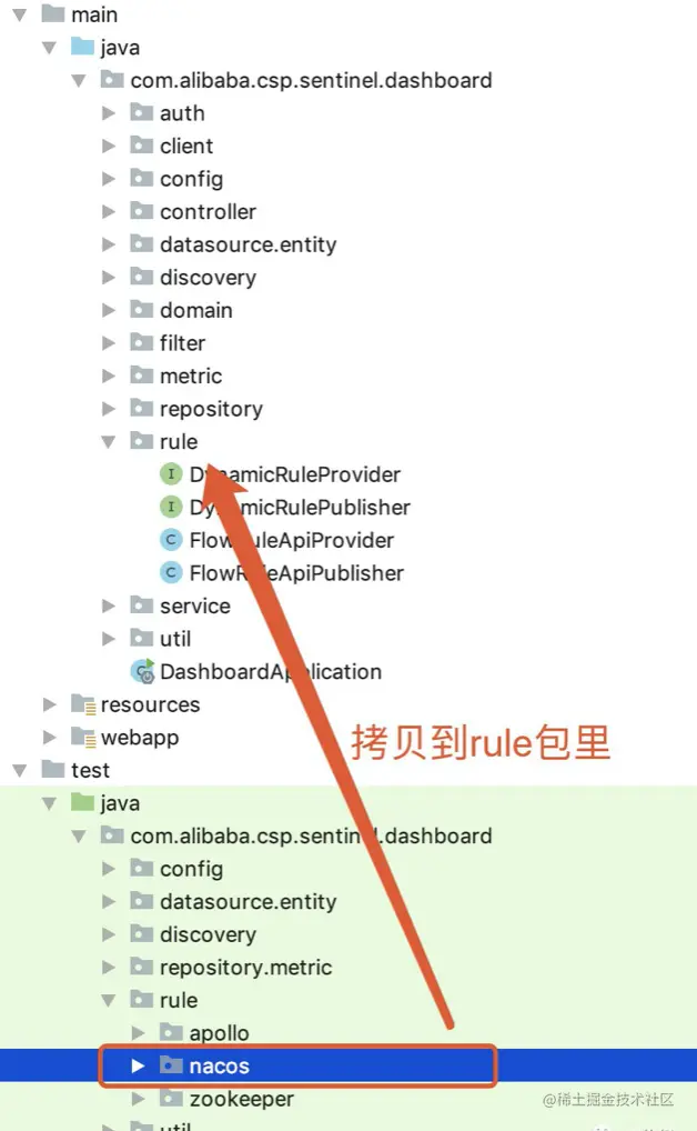 找到 sentinel-dashboard/src/test/java/com/alibaba/csp/sentinel/dashboard/rule/nacos目录,将整个目录拷贝到 sentinel-dashboard/src/main/java/com/alibaba/csp/sentinel/dashboard/rule/nacos