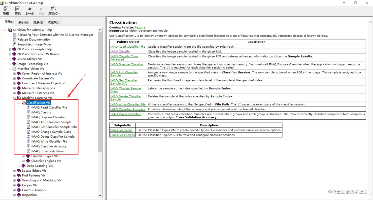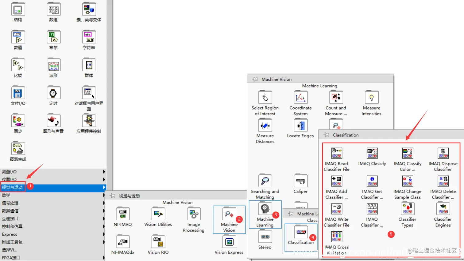 Nl Vision还提供了对彩色样本图像进行训练和分类的函数。它们位于LabVIEW的视觉与运动→Machine Vision→Machine Learning →Classification函数选板中,如下图所示: