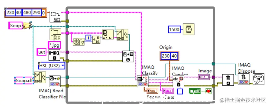 - 程序先用IMAQ Read Classifier File从NI色彩分类训练器创建的色彩分类器文件Soap.clf中读取学习到的样本特征等信息;