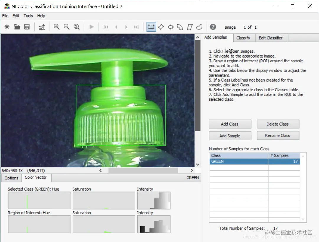Nl Vision提供了两种色彩训练方法,一是使用NI色彩分类训练器离线完成色彩训练(位于:National Instruments\Vision\Utility\Color Classification Training Interface\Color Classification Training.exe),二是使用程序代码在运行时完成色彩训练。