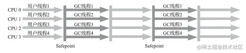 对于安全点,另外一个需要考虑的问题是,如何在垃圾收集发生时让所有线程都跑到最近的安全点,然后停顿下来。这里有两种方案可供选择: