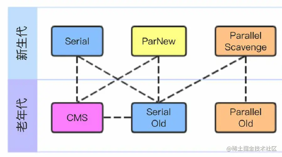 首先要明确一点哈,如果说收集算法是内存回收的方法论,那么垃圾收集器就是内存回收的具体实现。垃圾收收集器也只是垃圾回收机制的一部分,hotspot虚拟机对于不同的区域采用不同的垃圾收集器,每种垃圾收集器又可能采用不同的垃圾收集算法。