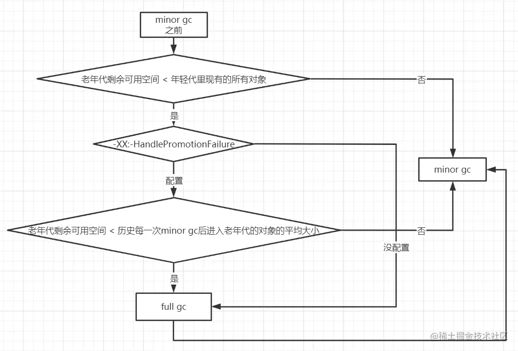 年轻代每次minor gc之前JVM都会计算下老年代剩余可用空间 如果这个可用空间小于年轻代里现有的所有对象大小之和(包括垃圾对象) 就会看一个“-XX:-HandlePromotionFailure”(jdk1.8默认就设置了)的参数是否设置了 如果有这个参数,就会看看老年代的可用内存大小,是否大于之前每一次minor gc后进入老年代的对象的平均大小。 如果上一步结果是小于或者之前说的参数没有设置,那么就会触发一次Full gc,对老年代和年轻代一起回收一次垃圾,如果回收完还是没有足够空间存放新的对象就会发生"OOM" 当然,如果minor gc之后剩余存活的需要挪动到老年代的对象大小还是大于老年代可用空间,那么也会触发full gc,full gc完之后如果还是没有空间放minor gc之后的存活对象,则也会发生“OOM”
