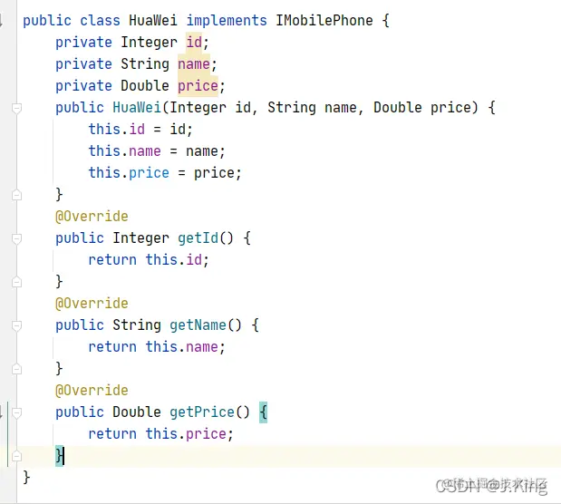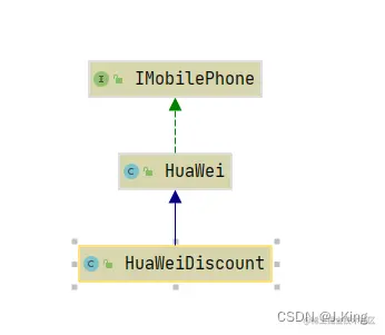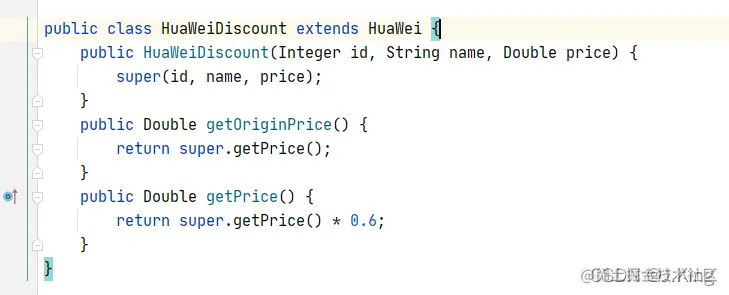 现在我们要给华为手机做活动,价格优惠。如果修改 IMobilePhone中的 getPrice() 方法,则会存在一定的风险,可能影响其他地方的调用结果。我们如何在不修改原有代码前提前下,实现价格优惠这个功能呢?现在,我们再写一个处理优惠逻辑的类, HuaWeiDiscount类: