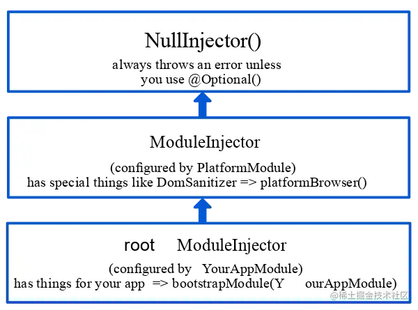 因此,在平台模块注入器之上,还有NullInjector()。而在平台模块注入器之下,则还有应用程序模块注入器。