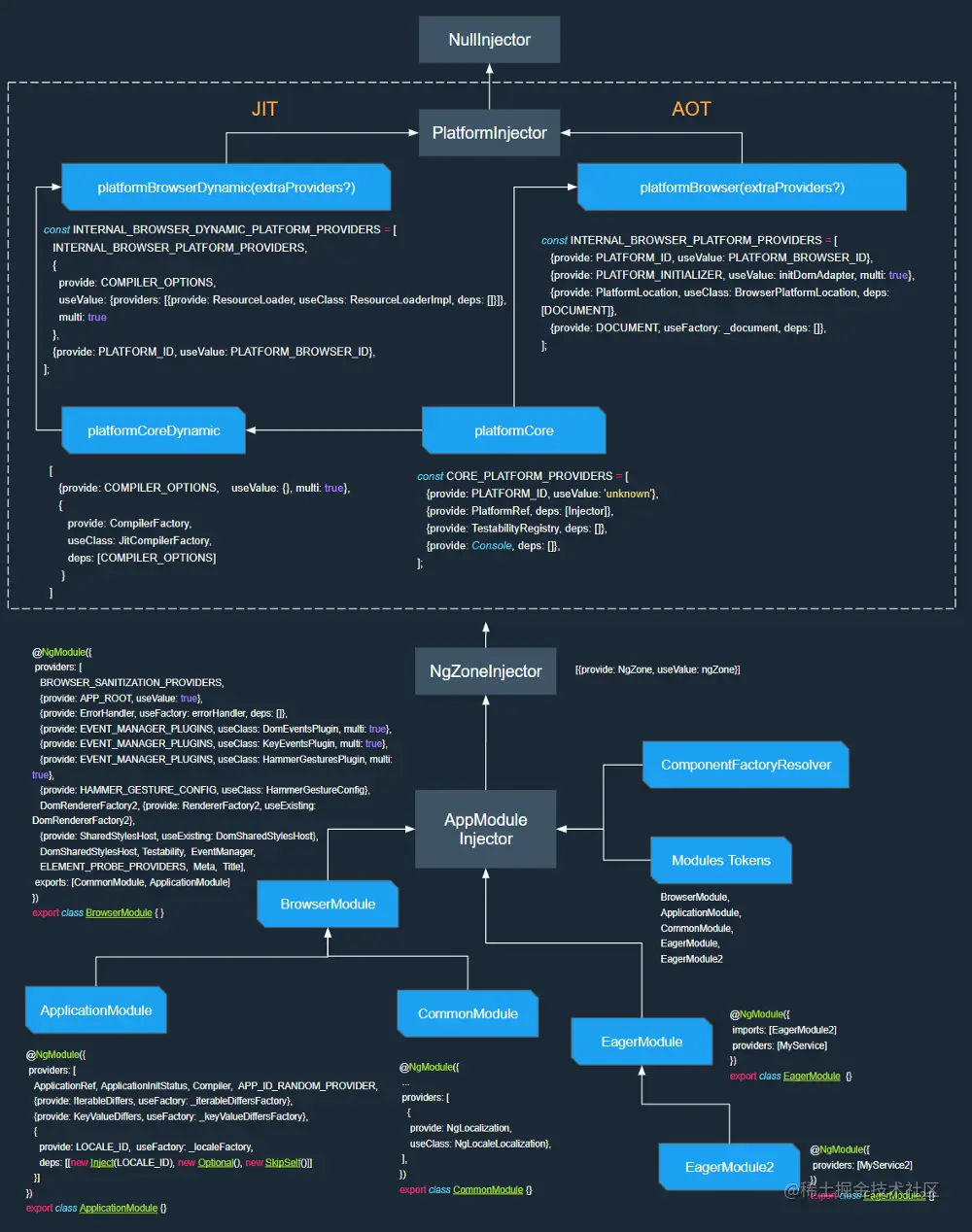 通过以上过程,我们知道 Angular 应用在创建平台的时候,创建平台的模块注入器ModuleInjector。我们从上一节Injector定义中也能看到,NullInjector是所有注入器的顶部: