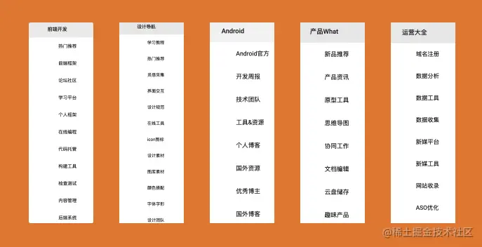 正如你所见,我将网站分为了五个大类(前端开发、Android、设计导航、产品、运营),每个大的分类下面都有几个小的分类,如下图所示。