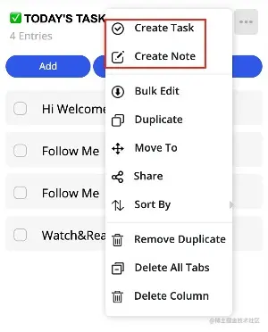 - 第一列:主要展示今天准备要做的事情,点击 Create Task 可以新建一个任务,点击 Create Note 可以新建一个笔记