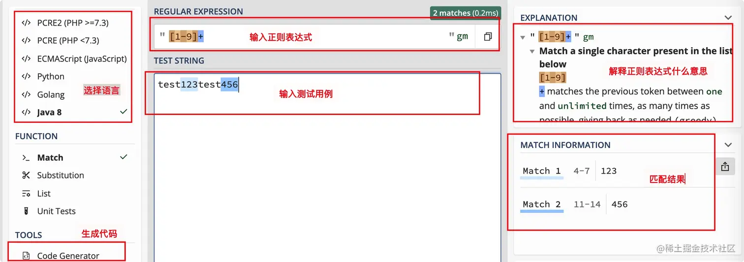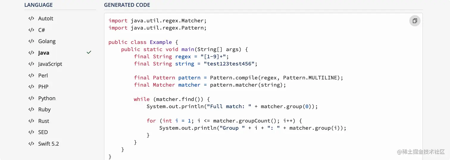 这里面包含了 文件格式的转换 、 正则表达式测试 、XML 格式转换 、二维码生成 等等,这里我主要想介绍正则表达式测试工具,这是一个非常好用的在线测试正则表达式的工具,不仅可以查看结果,而且还可以生成多种语言的代码。
