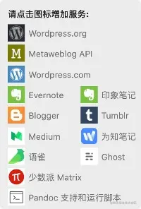 - 内置发布服务:可以发布到印象笔记、语雀、为知笔记、少数派等等很多地方