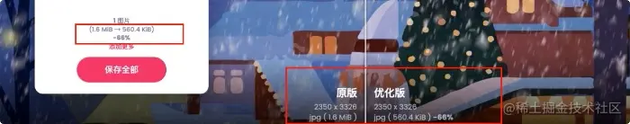 我们试试它的 压缩图片 功能,它的压缩效果非常的好,正如你所看到的 1.6MB 的图片压缩成了 560.4KB, 而且还可以对比原版和优化版。