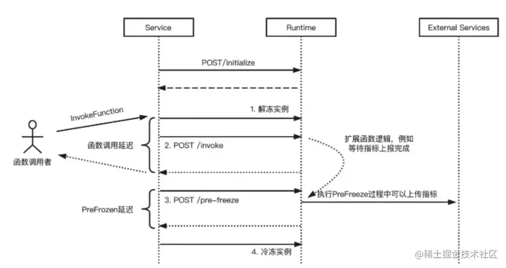 - PreFreeze:在每次函数计算服务决定冷冻当前函数实例前,函数计算服务会调用 HTTP GET /pre-freeze 路径,扩展开发者负责实现相应逻辑以确保完成实例冷冻前的必要操作,例如等待指标发送成功等。函数调用 InvokeFunction 的时间不包 PreFreeze Hook 的执行时间。