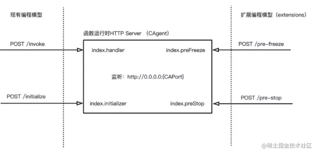 根据这些痛点发布了运行时扩展(runtime extensions)功能。该功能在现有的 HTTP 服务编程模型上扩展,在已有的 HTTP 服务器的模型中增加了 PreFreeze 和 PreStop webhooks。扩展开发者实现 HTTP handler,监听函数实例生命周期事件,如下图所示: