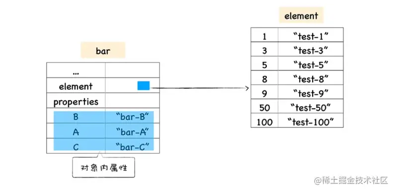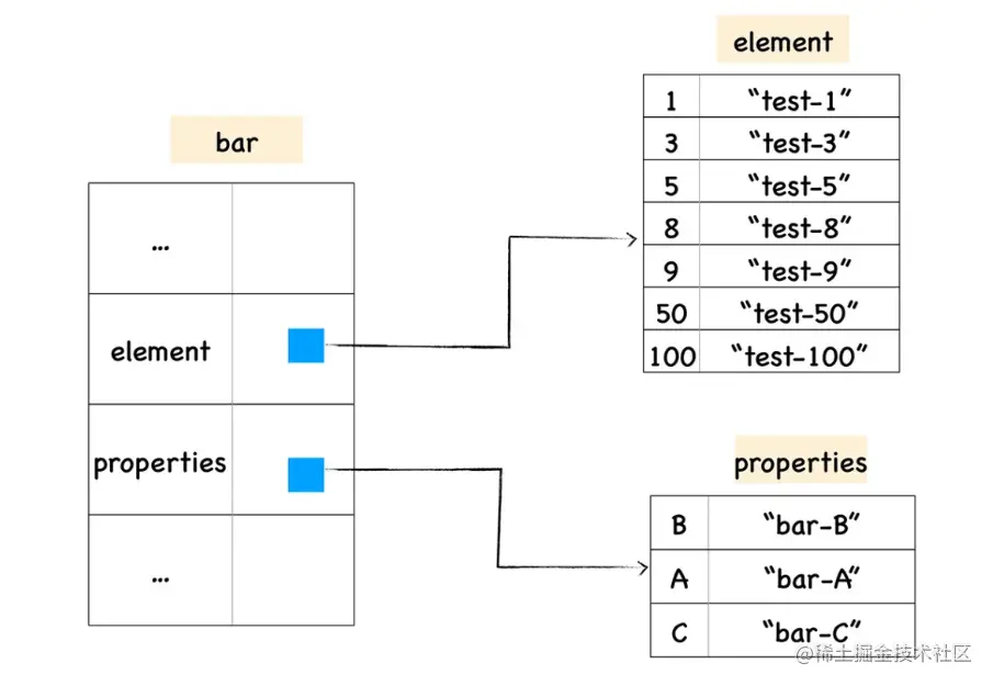 为什么会有慢属性呢?快属性虽然访问很快,但是如果要从对象中添加或删除大量属性,则可能会产生大量时间和内存开销来维护隐藏类,所以在属性过多或者反复添加、删除属性时会将常规属性的存储方式从线性结构变成字典,也就是降低到慢属性,而由于慢属性的信息不会再存放在隐藏类中,所以它的访问会比快属性要慢,但是可以高效地添加和删除属性。可以通过下图帮助理解: