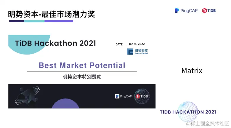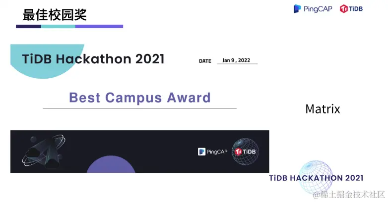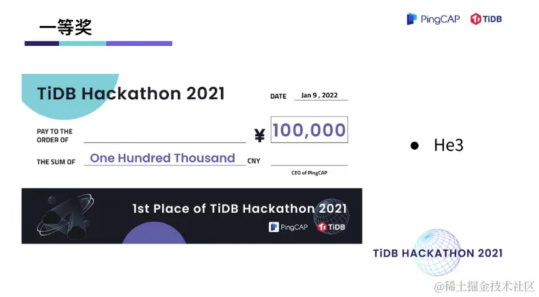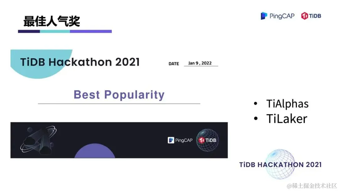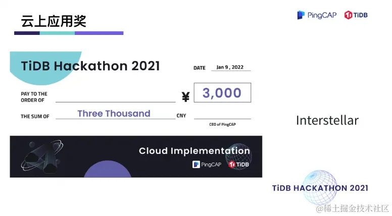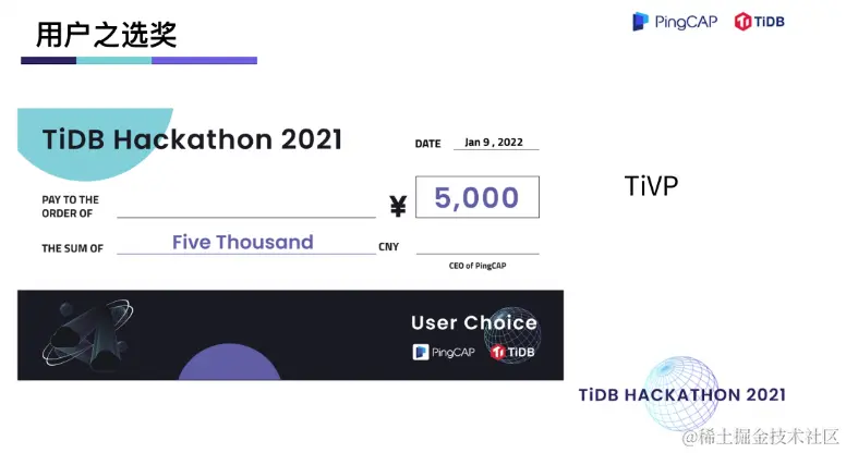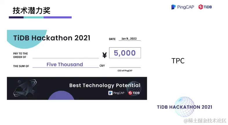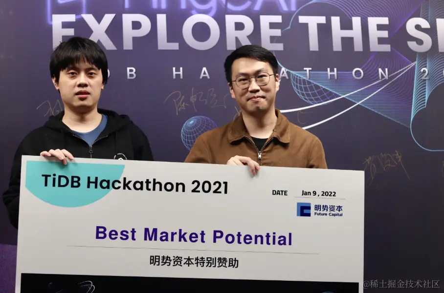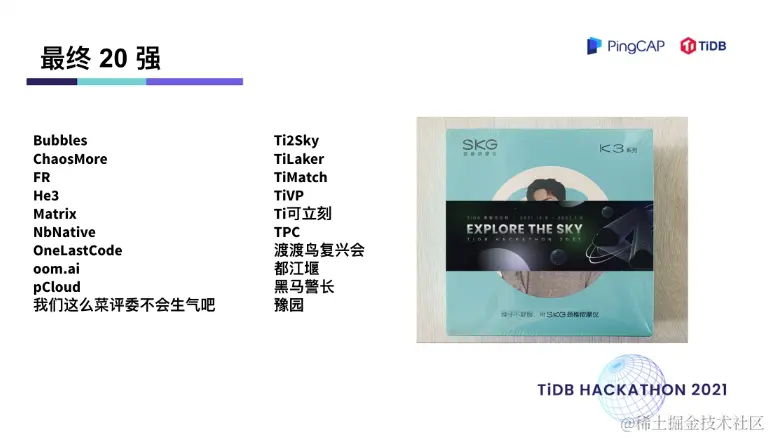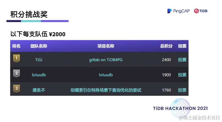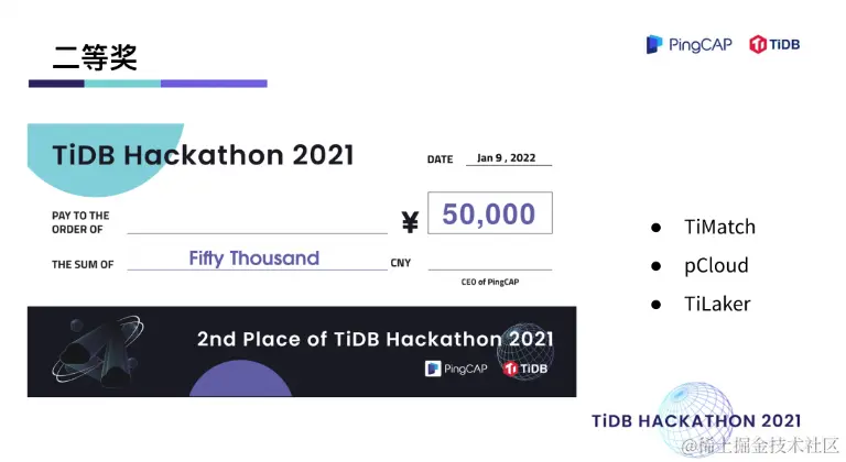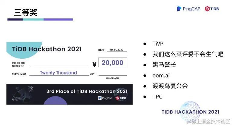 在两天一夜的 Hacking Time 中,围绕着内核、工具、生态、「∞」四大赛道,选手们拿出了众多令评委惊艳的项目。在 TiDB 内核方向做出不少 hardcore 、大幅提升性能的创新项目,在工具方向对 TiDB 的可观测性及诊断易用性做出了大幅优化,在生态扩展方向百花齐放,出现了语法完备的分布式图数据库,给 TiDB 打通了入湖的高速通道,很多项目其实已经在 TiDB 的 Roadmap 里,并已经具备落地的成熟度。最终,有 10 支队伍瓜分了总计 40万元的现金奖,另有 10 支队伍分获无限创意奖、校园团队奖、用户之选奖、最佳市场潜力奖、云上应用奖、积分挑战奖、技术潜力奖、最佳人气奖。