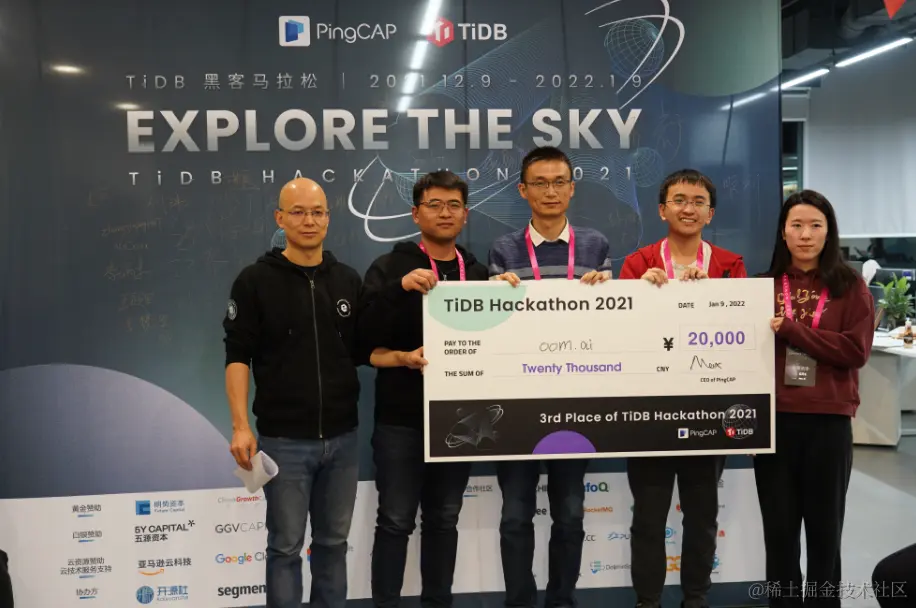 昨日, 主题为「Explore the Sky」的 TiDB Hackathon 2021 完美收官!今年已经是 TiDB Hackathon 第五届赛事,参赛规模创历届之最,共有 279人 ,64 支队伍参赛,有来自腾讯、华为、网易、美团、字节、京东、滴滴等企业的上班族,也有来自北大、北邮、中科院、上海交大、RMIT 等高校的学生。