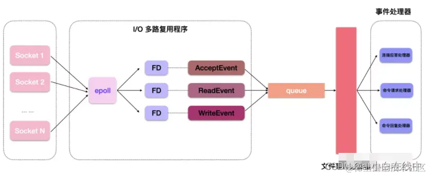 I/O 多路复用程序(epoll / kqueue / select...,依据操作系统的不同,会采用不同的函数,Linux 使用的是 epoll,Mac OS 则是 kqueue)会监听多个套接字,每当一个套接字准备执行应答,读写,关闭等操作时,就会产生对应的文件事件,这些事件会存储到一个事件队列中,并由队列向文件事件分派器传送。而文件事件分派器会根据这些事件对应的类型来调用不同的事件处理器执行相应的事件回调函数。