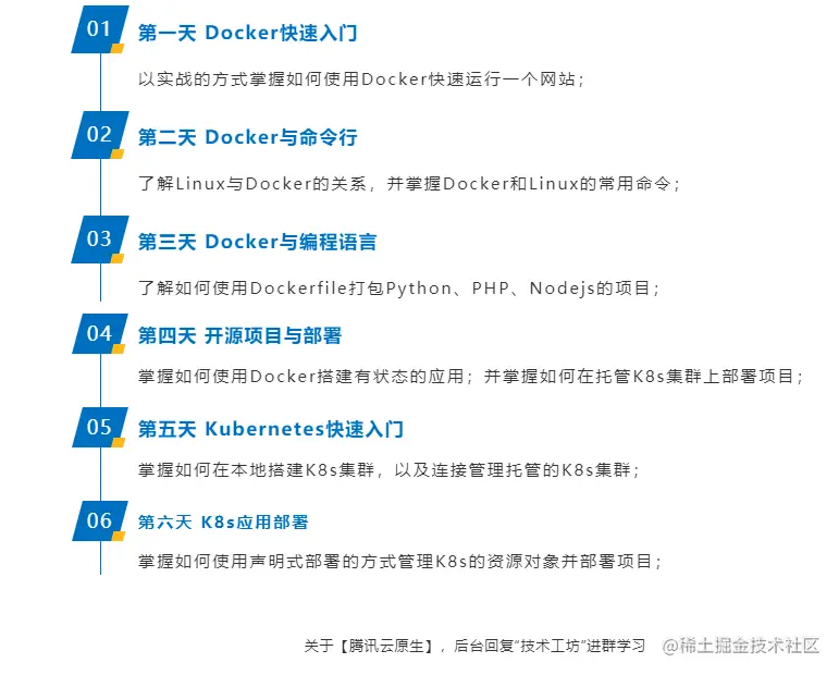 云原生在线技术工坊,由腾讯云原生【燎原社】精心打造,旨在帮助更多对云原生技术感兴趣的开发者快速且系统的掌握Docker 与 Kubernetes。