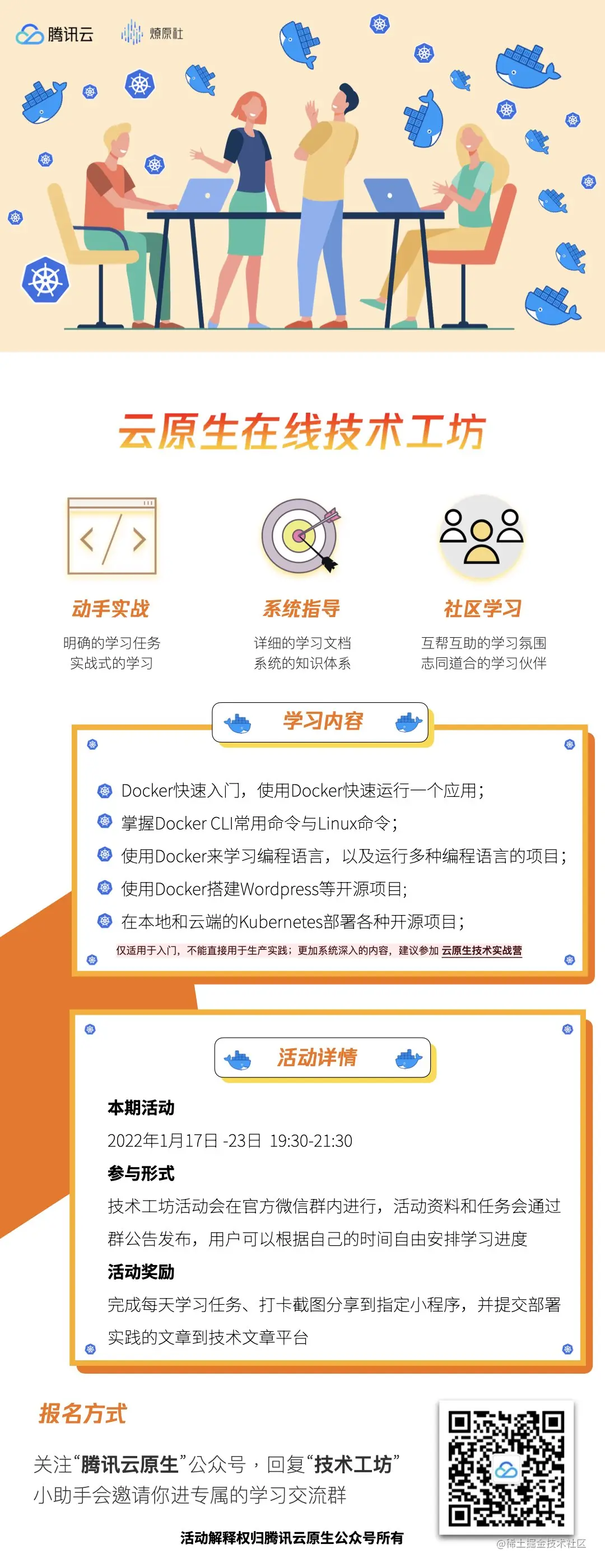 技术工坊仅供入门学习,适合小白初步建立认知。云原生技术重要且复杂,腾讯云原生【燎原社】也推出了专业而又系统的线下云原生技术实战营,需要系统化深入学习的同学,可报名云原生技术实战营课程,腾讯云技术专家现场教学,3天搞定云原生容器化改造过程中的实际问题,还有官方认证证书加持,扫码或点击“阅读原文”一键直达: