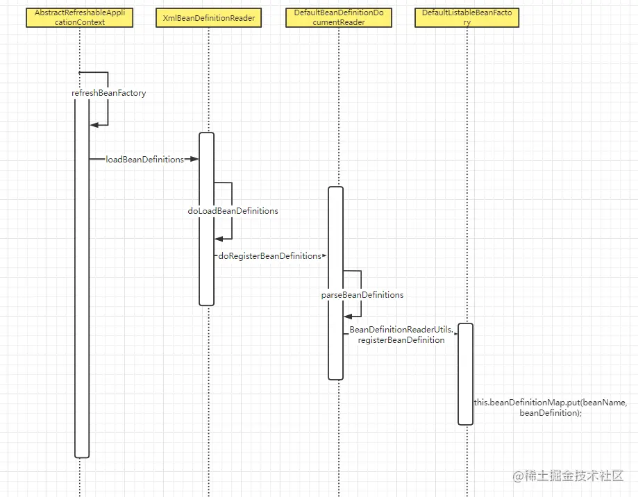 BeanDefinition加载流程入口在AbstractRefreshableApplicationContext#refreshBeanFactory ⽅法中,会调用到loadBeanDefinitions方法,这个方法最终会由XmlBeanDefinitionReader的loadBeanDefinitions方法来完成。然后会调用它自己的doLoadBeanDefinitions方法。