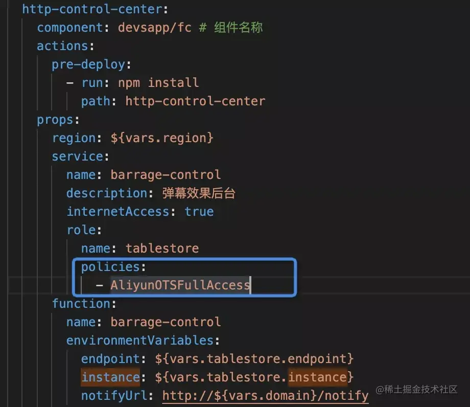 除了实例名称和公网访问地址外数据库的初始化还需要 用户的秘钥信息。鉴于秘钥信息的敏感性比较高,不建议直接把秘钥信息配置到 s.yaml 里,而是通过给函数服务授权 tablestore 角色权限,让函数内置临时秘钥信息。