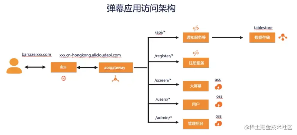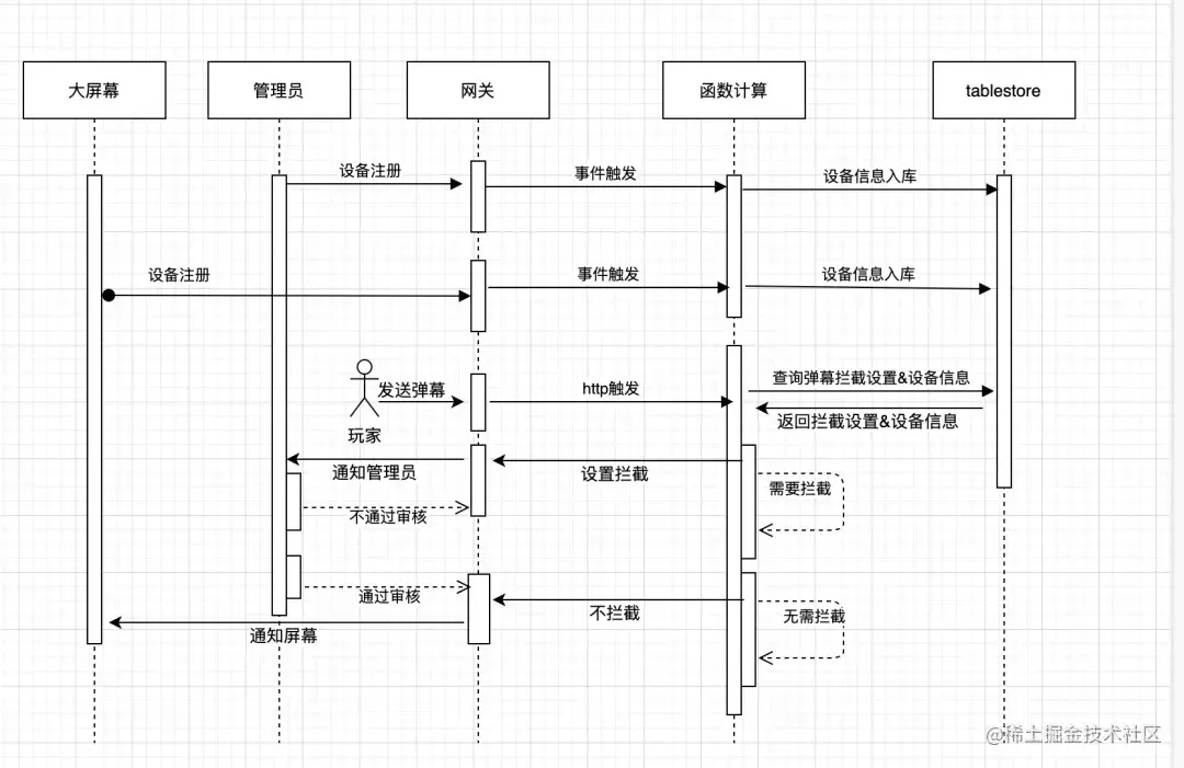 弹幕应用总工由大屏幕, 个人用户,管理员三个客户端,以及一个注册设备的服务 & api 服务组成。客户端跟服务端的长链接由网关来承载,每次客户端连接到网关的时候,网关都会存储设备编号,并且触发一次注册函数,设备编号存储到 tablestore。