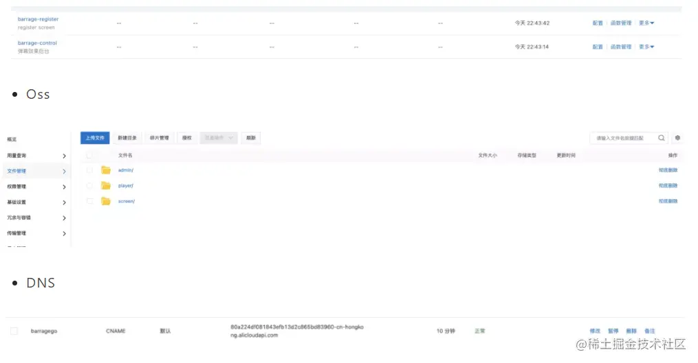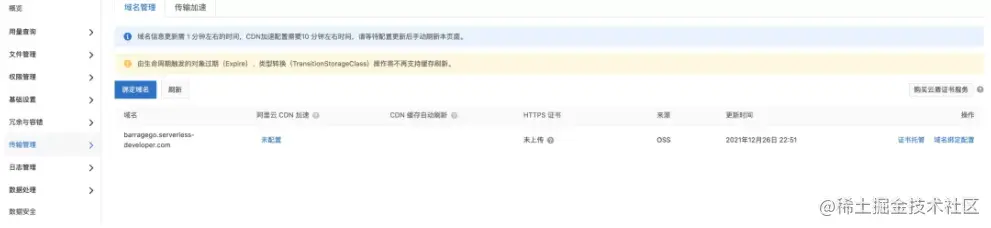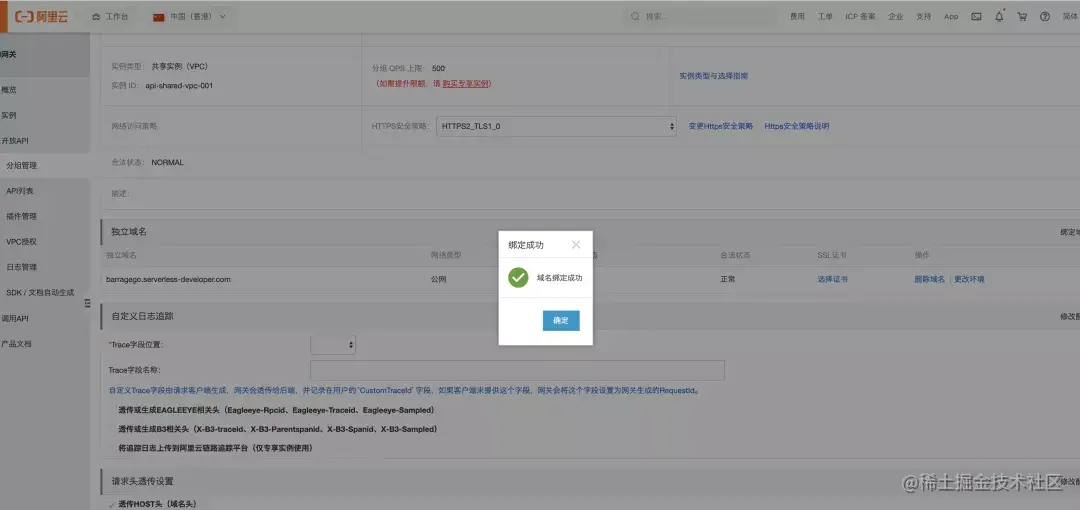 发现访问不同,检查发现原因是 apigateway 的域名和 oss 域名都未绑定成功,我们手动处理一下: