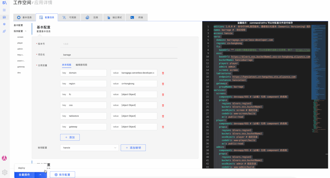 初始化之后,我们重新进入配置页面,对项目进行部署。配置信息 -> 全量操作 -> deploy 点击后其他的就交给 Serverless Devs了,它会帮助我们完成: