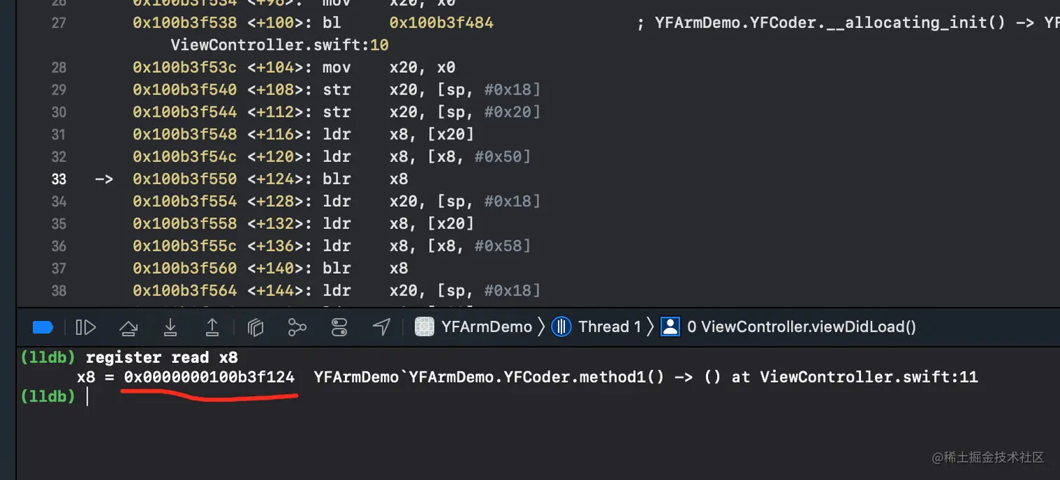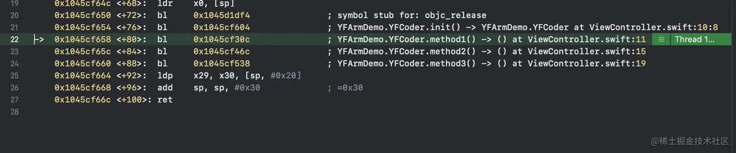0x1000e3538 <+100>: bl 0x1000e3484 ; YFArmDemo.YFCoder.__allocating_init() -> YFArmDemo.YFCoder at ViewController.swift:10