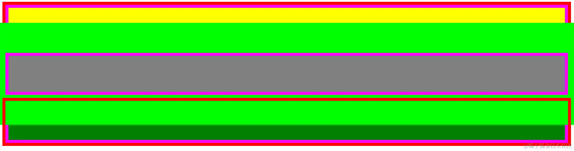 结果是中间的outline覆盖了上面和下面的内容、背景、边框部分,如果给outline一个足够大的值的话,可以覆盖除了自己之外的全部屏幕。类似图中那样,如果绿色继续延伸,那么就可以铺满屏幕了。