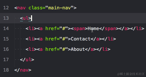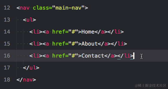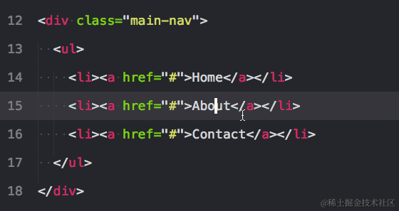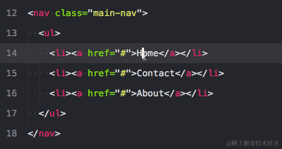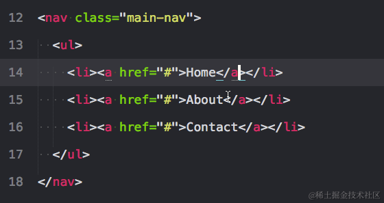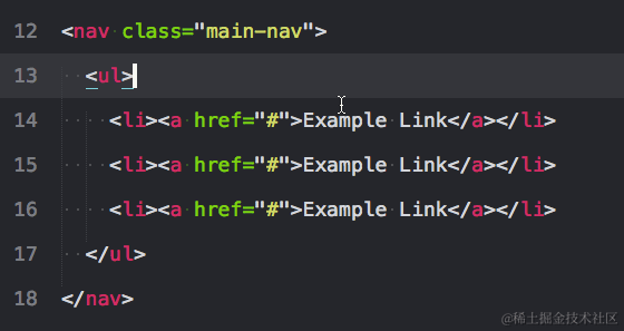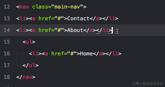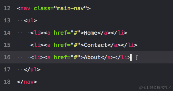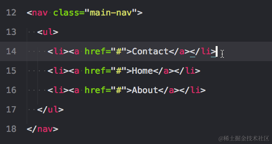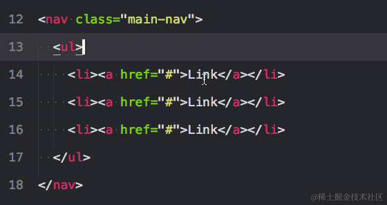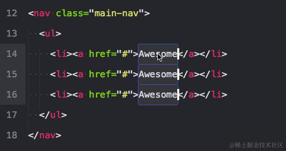这是一个法宝。也许你希望所有属性保持不变,但只是想选择标签。这个快捷键为你这样做,会注意到你可以在一次操作多个标签。ps:需要Emmet插件(可以直接到后面看插件的安装)