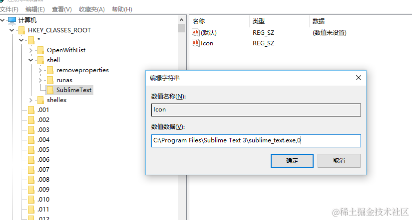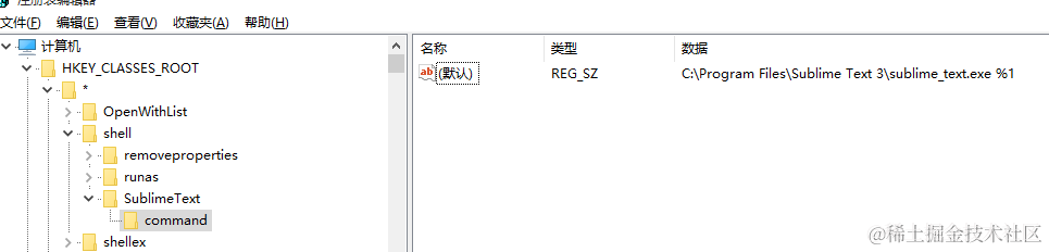 Icon,值为 “sublime_text.exe所在路径,0”,例如:C:\Program Files\Sublime Text 3\sublime_text.exe,0- 右键SublimeText项,新建项,命名为command,默认值为 “sublime_text.exe所在路径 %1”,例如: