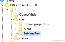 HKEY_CLASSSES_ROOT→ * → Shell下面新建项命名为SublimeText- 右键SublimeText项,新建字符串值,命名为