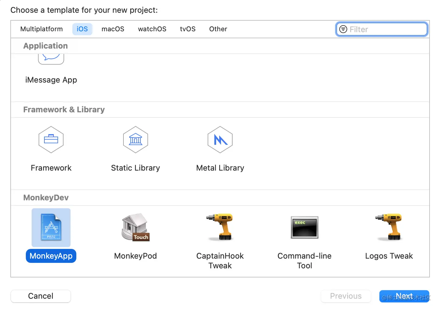 1、点击File - New - Project...创建iOS项目,选择MonkeyApp。