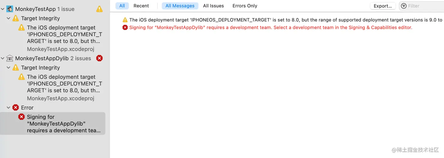 在MonkeyTestAppDylib 的 Build Settings 的Other Linker Flags 中移除掉 /usr/lib/libstdc++.dylib和-weak_library。
