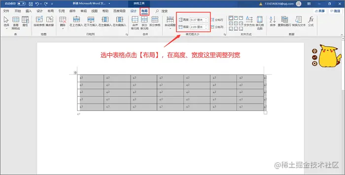 步骤3.鼠标左键选中需要调整的表格,此时会出现一个新的【布局】,点击它后通过调整宽、高度就可以设置表格的列宽。