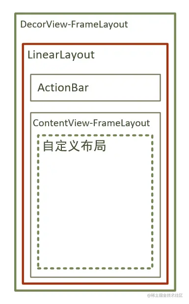 每一个Activity都对应一个Window也就是PhoneWindow的实例,PhoneWindow对应布局是DecorView,也就是所有Activity的根布局都是DecorView,DecorView是一个FrameLayout,DecorView之下是一个竖向的LinearLayout,包含一个ActionBar和content,content也就是承载我们编写的Activity布局的控件是一个FrameLayout,也是我们调用setContentView所设置布局的父控件,整个结构如下: