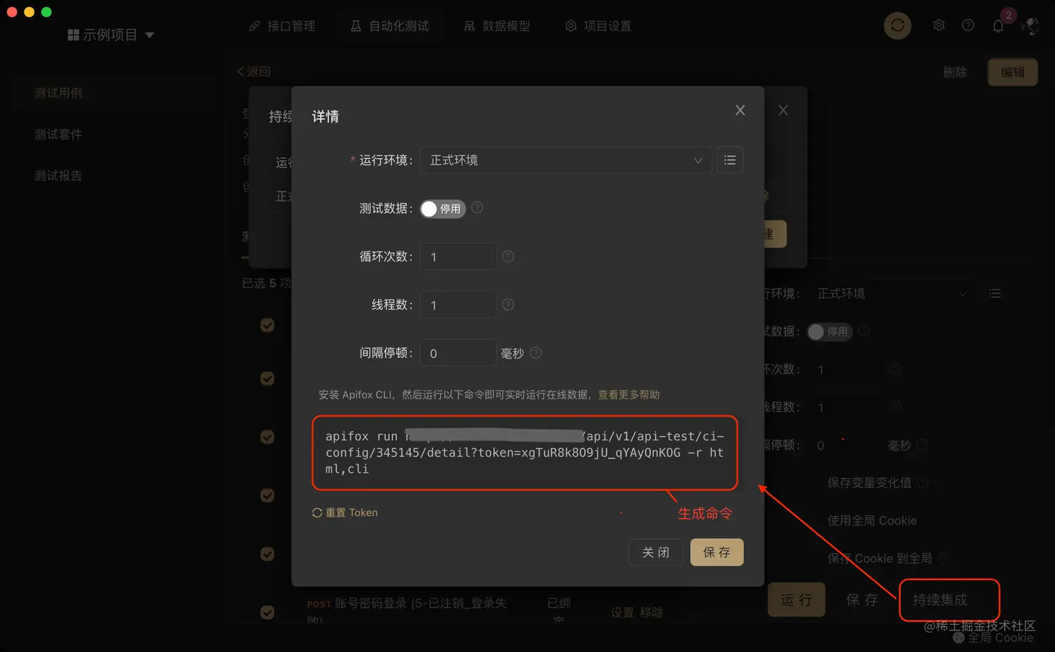 Apifox 支持通过 ApifoxCLI 实现持续集成,只要在服务端安装 ApifoxCLI ,在 Apifox 上生成测试用例、测试套件的任务命令,运行时将实时从云端获取测试内容进行自动化测试。