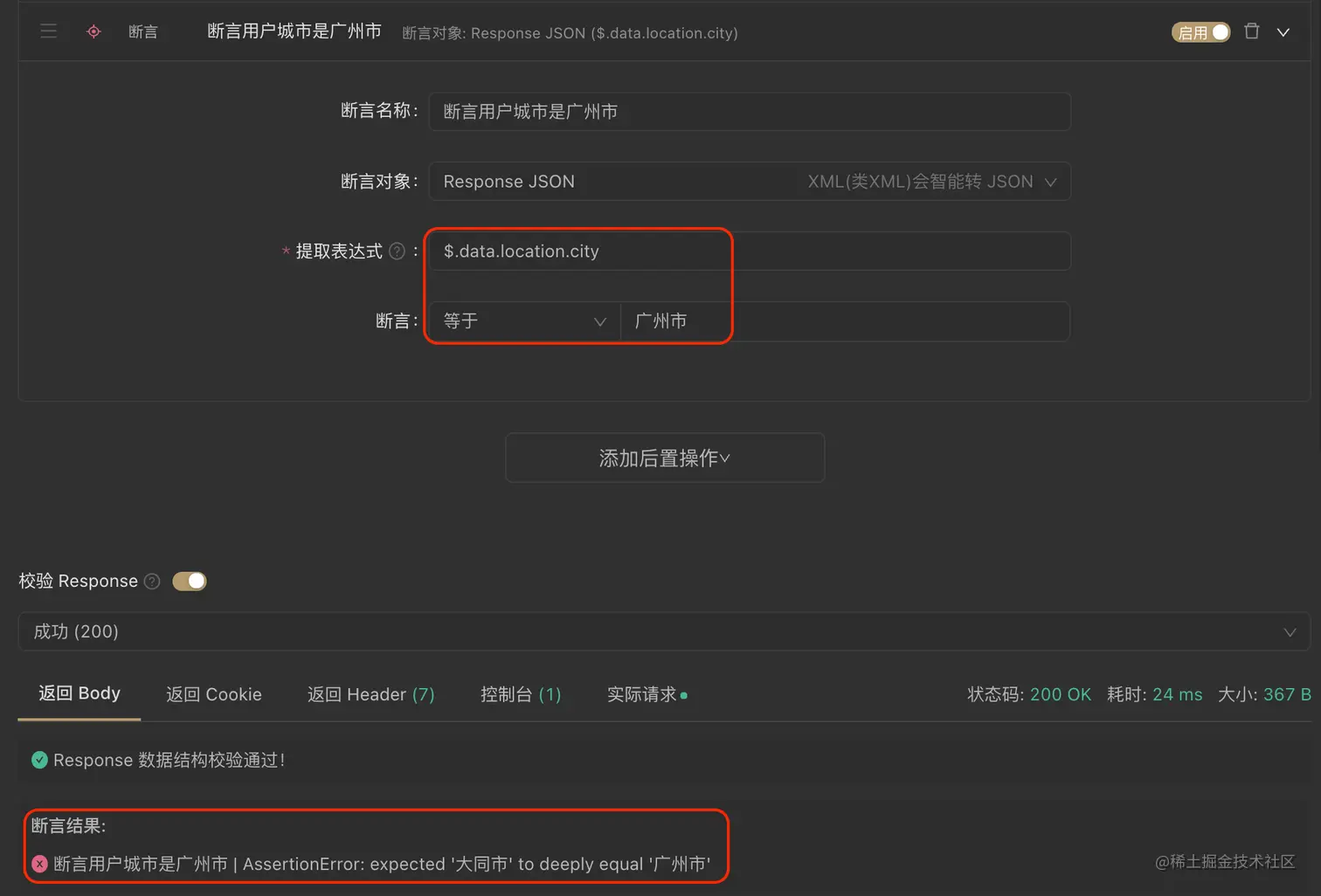 断言操作可以设定断言的对象和期望的结果,接口运行时验证返回结果是否符合预期,并提示结果是通过还是失败。这里我们写了一个例子,对响应的 JSON 数据提取 city 字段,断言该字段值="广州市"。这里的提取表达式遵循 JSON PATH 的规范。