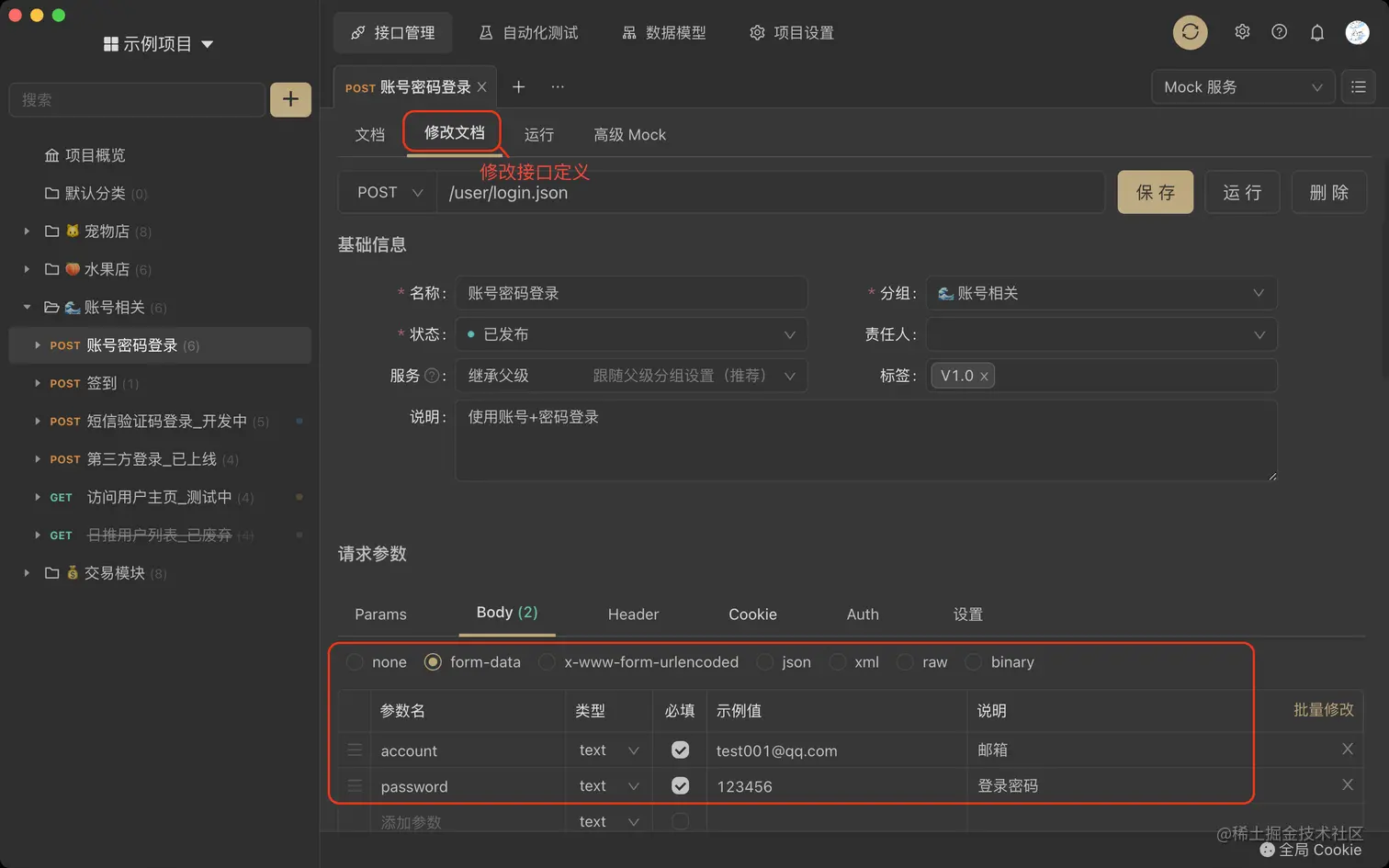 如图,我们先熟悉接口定义。在修改文档可以编辑接口信息:接口路径为/user/login.json,请求方式是 POST ,请求 body 参数有 account 和 password: