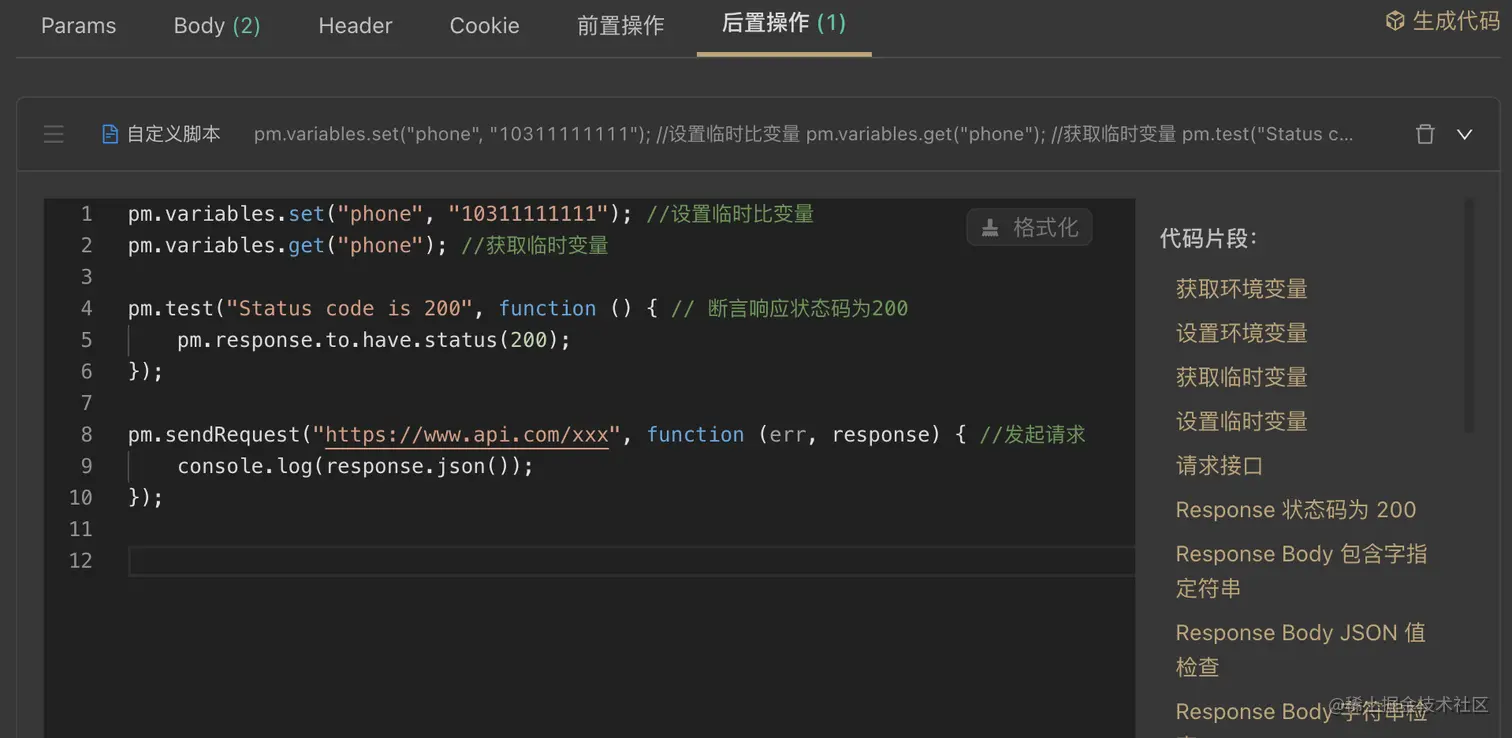 Apifox 的脚本完全兼容 postman 的语法,完全可以无缝迁移过来,此外还支持调用外部代码、提供多种内置库,这点能满足我们更多拓展性的测试需求。