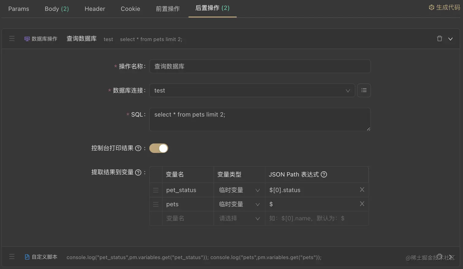 测试前后可能需要使用数据库进行增删改查, Apifox 的数据库操作是也非常友好,配置好连接信息后设置 SQL 语句(支持变量),查询结果支持提取为变量,结合调试功能,可以非常便捷地编写用例。