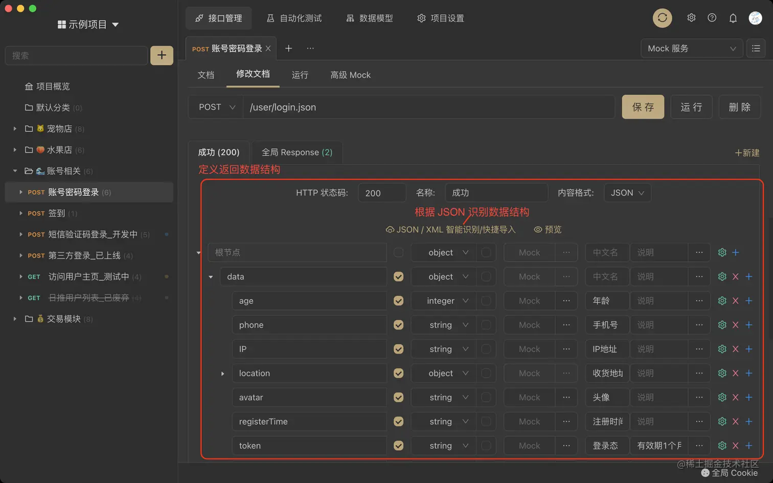 接口响应的数据类型、状态码、格式定义界面都是可视化的,可以通过输入一段 json 快捷识别数据结构。