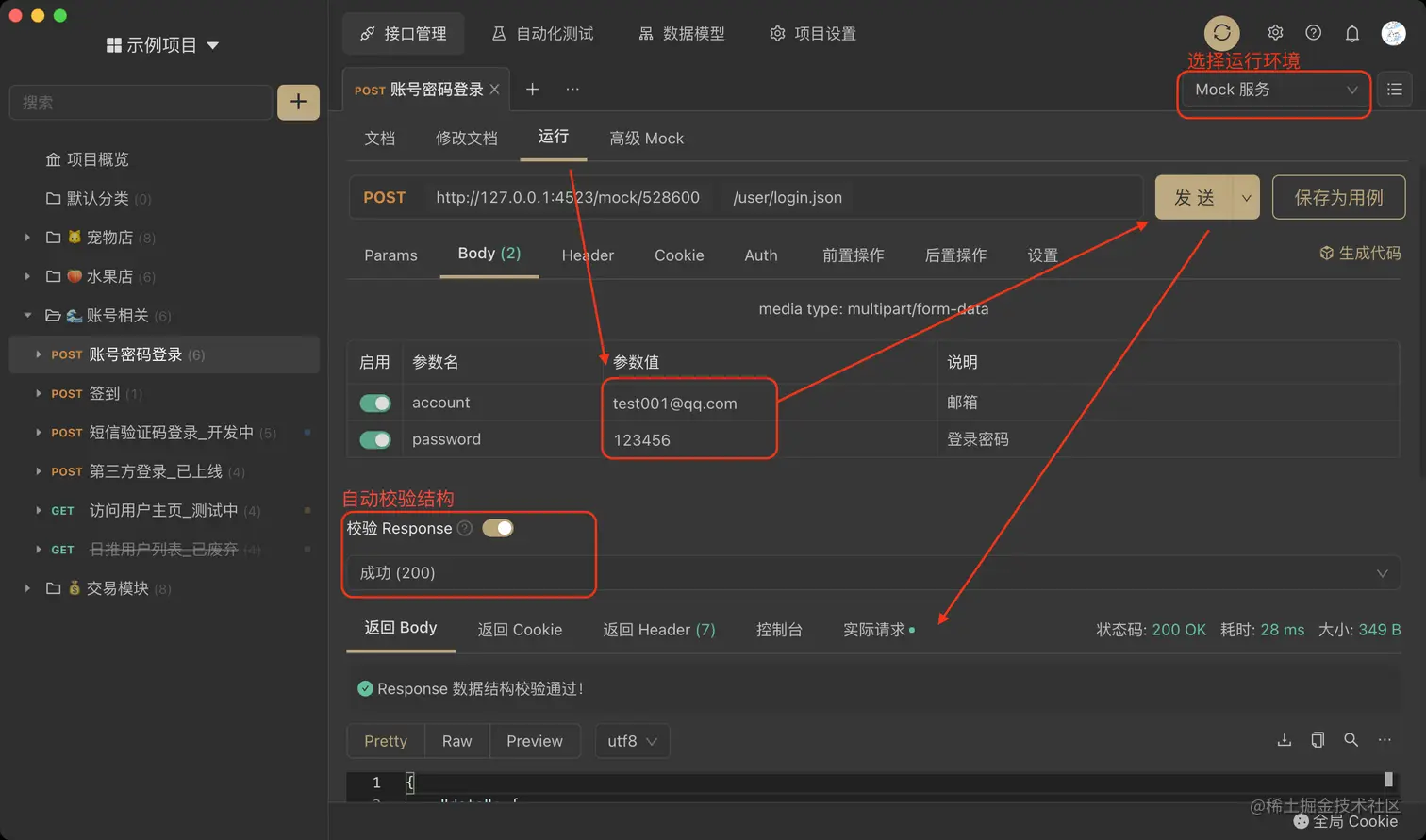 上图中,我们发现 Apifox 的界面上有一个校验 Response,这是工具的特色功能——只要打开开关,系统会根据所选择的数据结构,自动比对响应状态码和字段类型