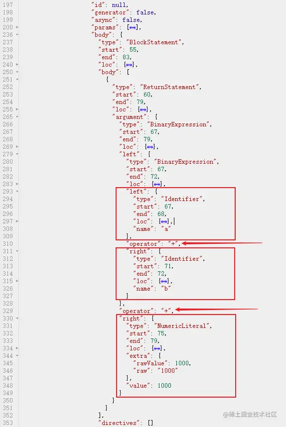 在原始代码中,这个函数内只有一条return语句,对应这里的ReturnStatement(返回语句)。 argument是 return语句返回的内容。假如return语句没有返回内容,那么argument节点值为null。在原始代码中,return返回的是a+b+1000,AST解析成了BinaryExpression(二项式)。JS中的二元运算符都可以解析成 BinaryExpression二项式主要分为三部分:left、operator和right。可以看出是把a+b作为left,1000作为right。对于right节点,type为NumericLiteral(数值字面量),value为1000。对于left节点,依然是一个二项式,代码如下:
