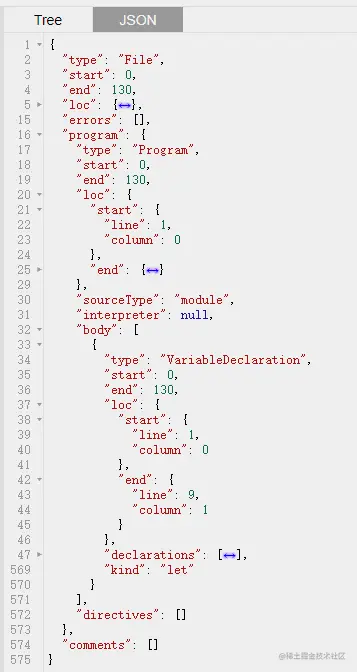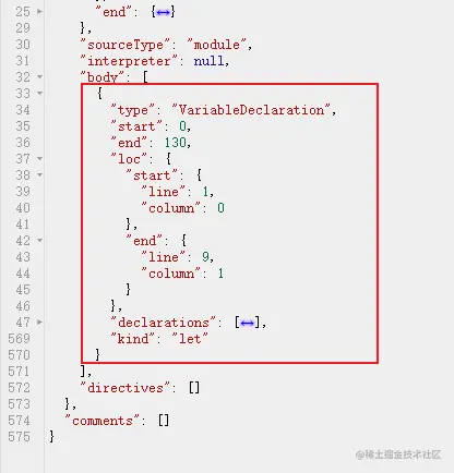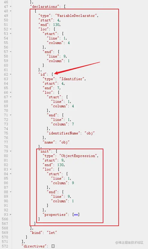 字符串形式的type字段表示节点的类型,如上述代码中的VariableDeclaration每一种类型的节点都定义了一些附加属性,用来进一步描述该节点类型。VariableDeclaration表示这是一个变量声明语句,kind表示变量声明语句所使用的关键字,declarations指声明的具体的变量。declarations是一个数组,因为一个let关键字可以同时声明多个变量,如let a,b,c;当前只声明了一个变量obj,所以declarations只有一个成员。再来查看declarations中的内容: