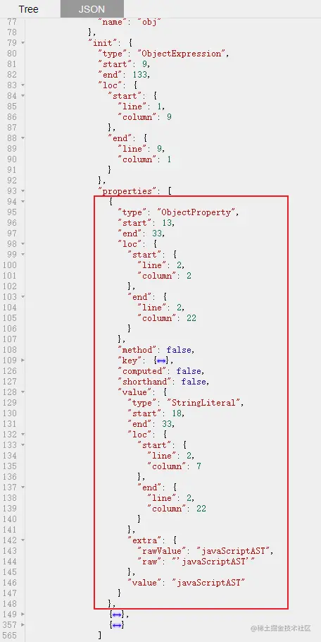 在原始代码中,把对象字面量赋值给了obj,在AST中把这个称为Object Expression(对象表达式)。有对象自然就有属性,还可以有多个属性,因此 properties是一个数组,一个属性对应一个成员。接着查看 properties中的第一个属性: