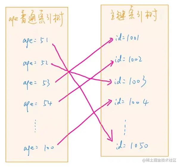 当然,这是理想情况,如果 age 对应的 id 值不是顺序的话,那当我们顺序取 age 的时候,id 的获取就是乱序随机的了,性能就会比较差。解释下为什么这里乱序查询的性能就比较差: