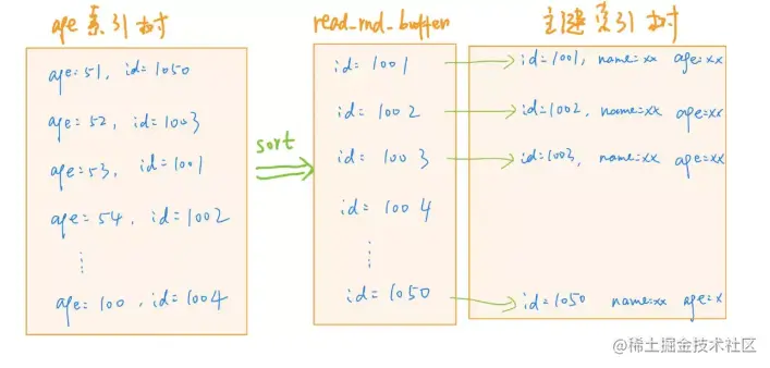根据普通索引 age,找到满足条件的主键 id,然后将 id 值放入 read_rnd_buffer 中